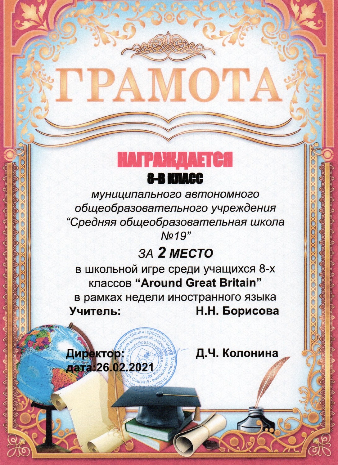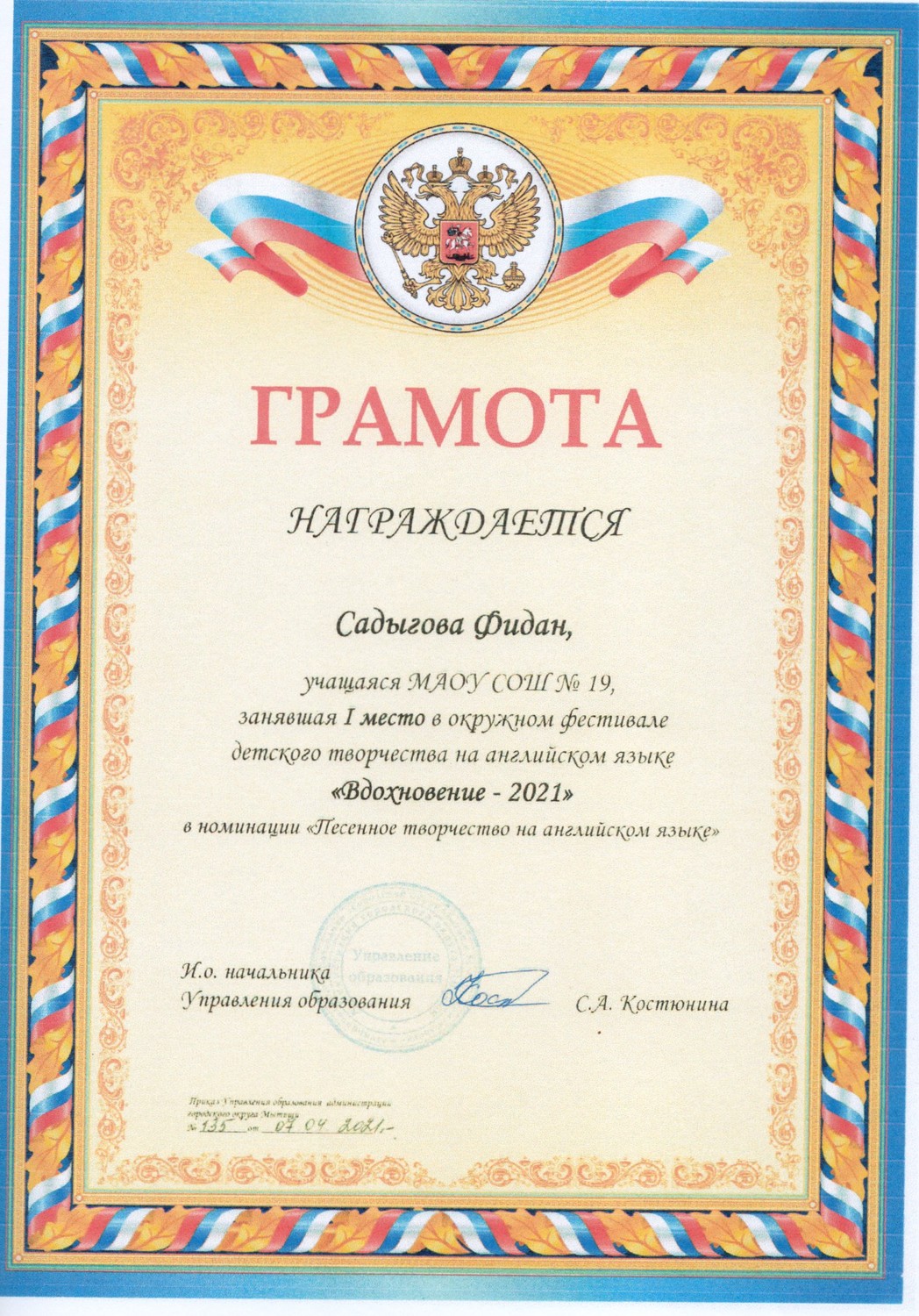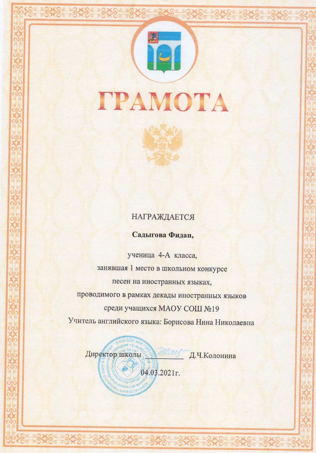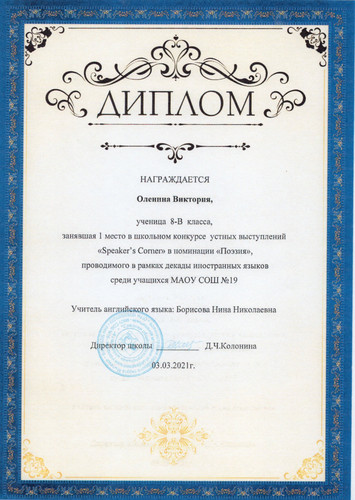 в номинации "Поэзия" в рамках школьной декады иностранных языков.